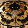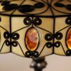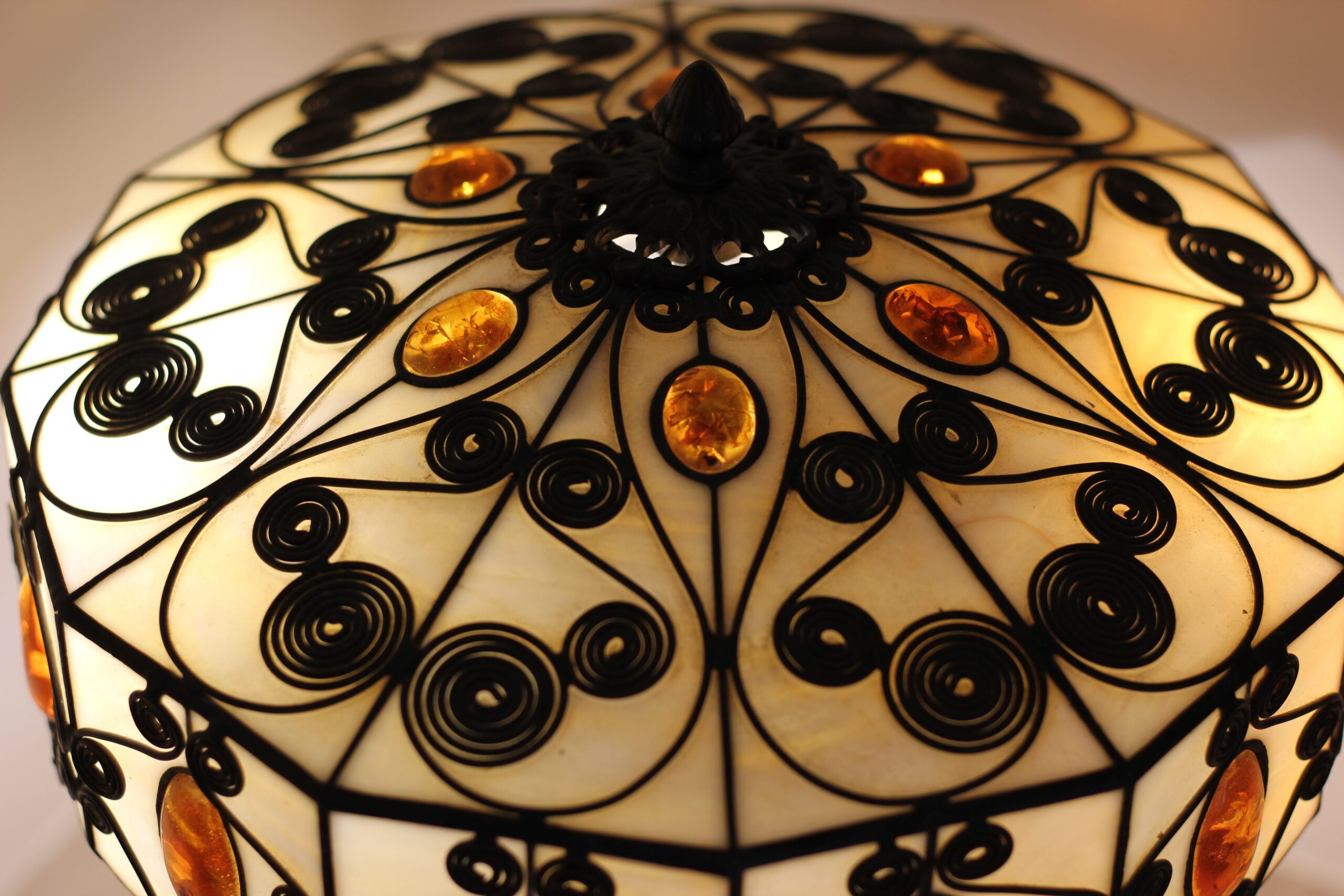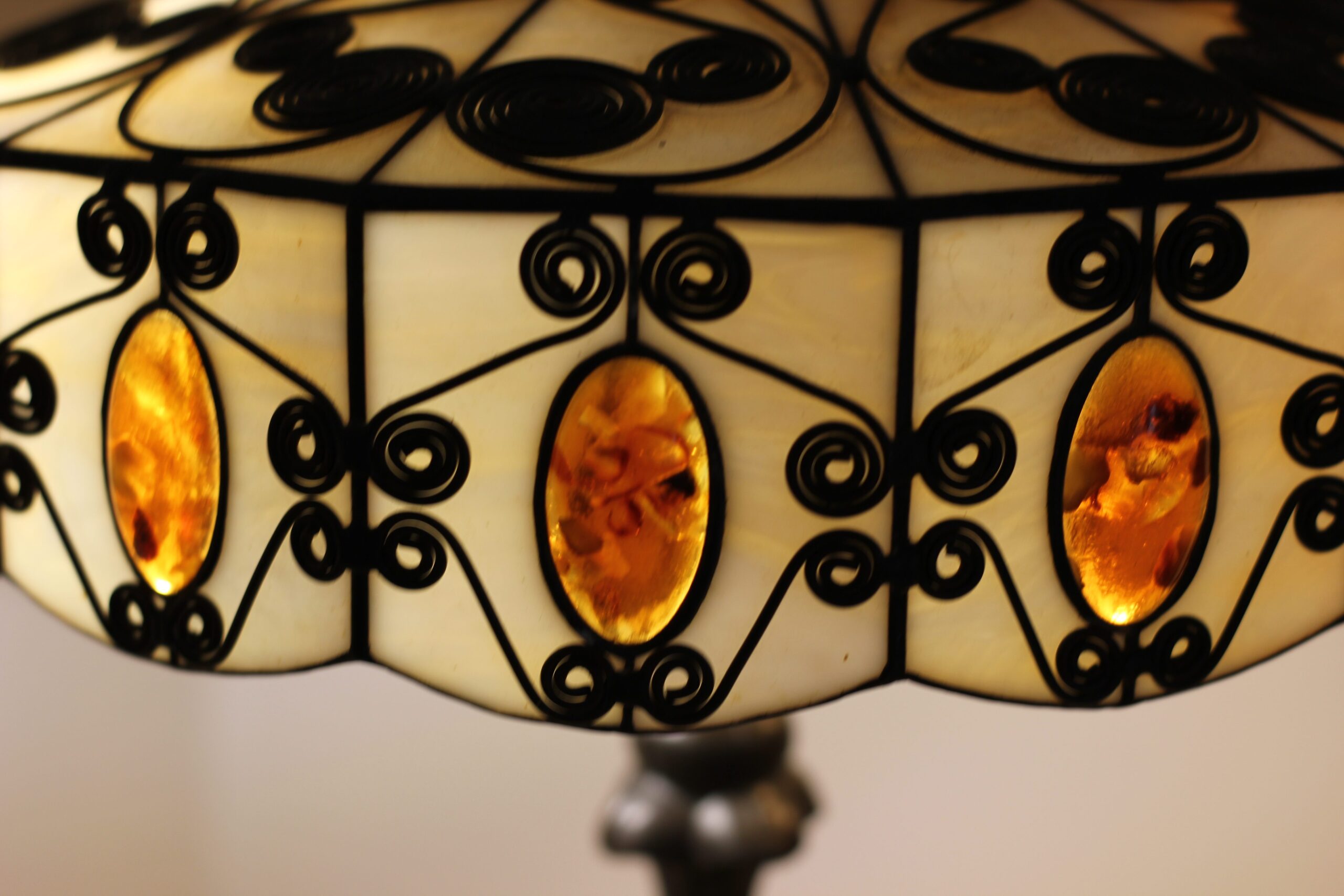 Pied acier patiné. Dôme vitrail composé de pâte de verre et d’ambre.