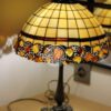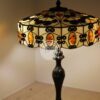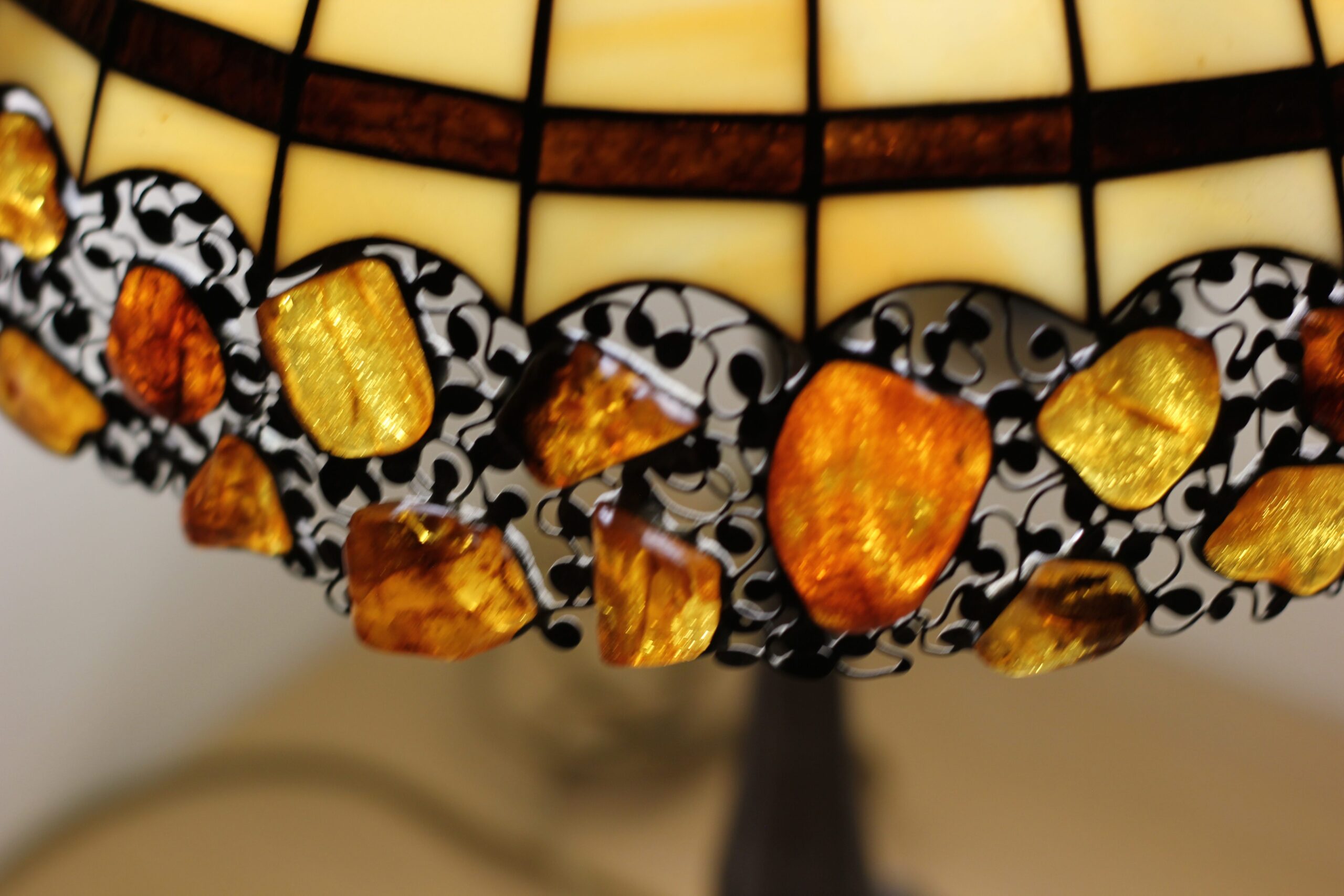 Pied acier patiné. Dôme vitrail composé de pâte de verre et d’ambre.