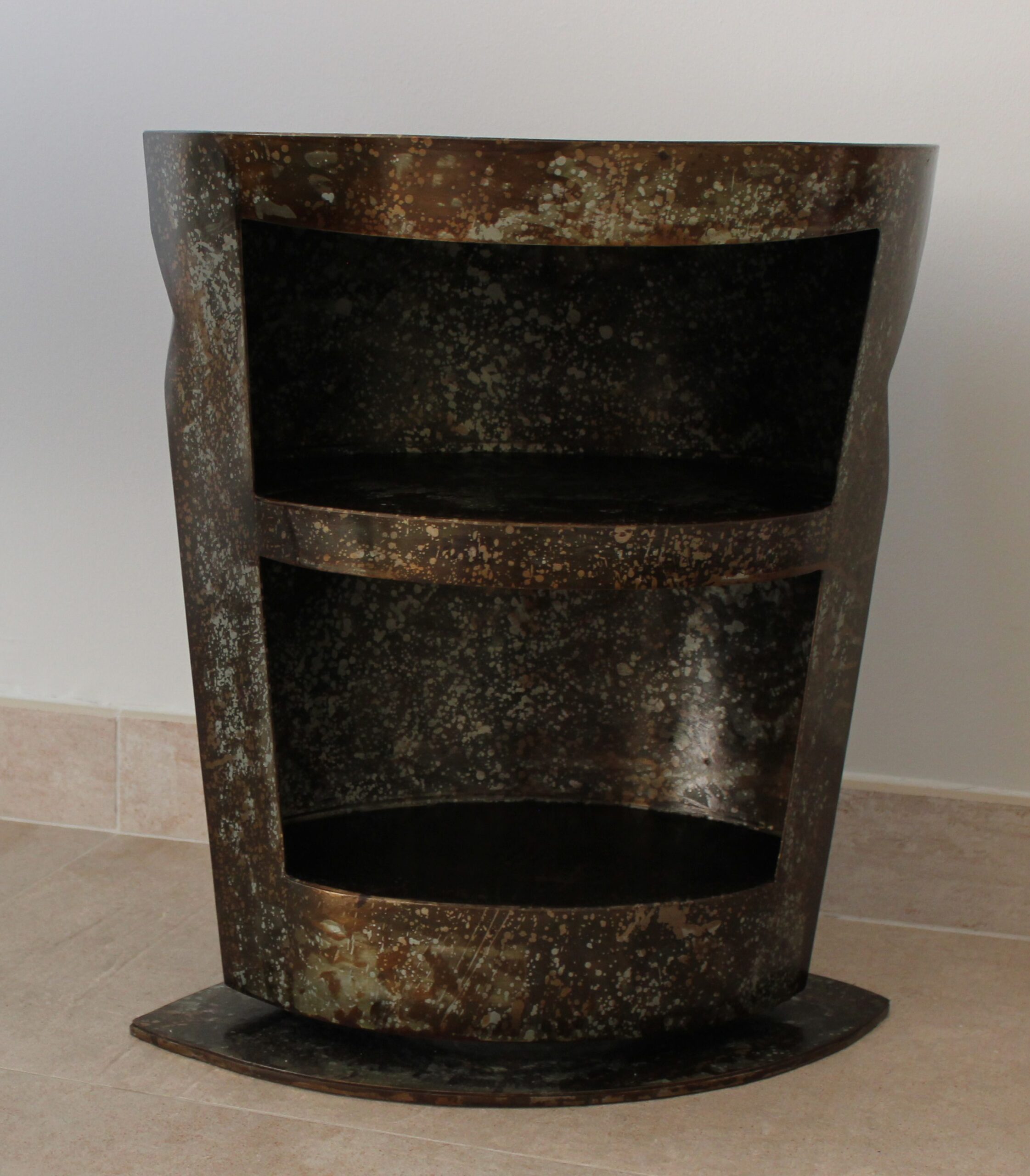 Acier brossé, patine nacrée, intérieur plaqué d’érable moucheté.